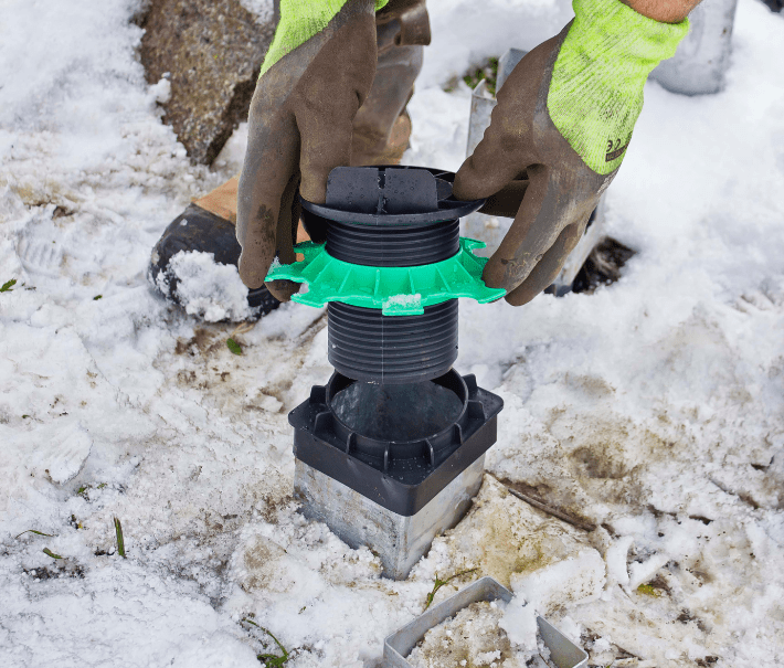 Le plot Elevo® se positionne sur un pieu métallique de 90x90mm ancré dans le sol. Une fois fixé, sa hauteur peut être ajustée manuellement grâce à un écrou de réglage et/ou par l’ajout de rehausses de 60 mm (jusqu’à 4 maximum). Il est conçu pour supporter des lambourdes en bois naturel ou en aluminium et permet de réaliser une terrasse s`ans décaissement ni préparation du sol.