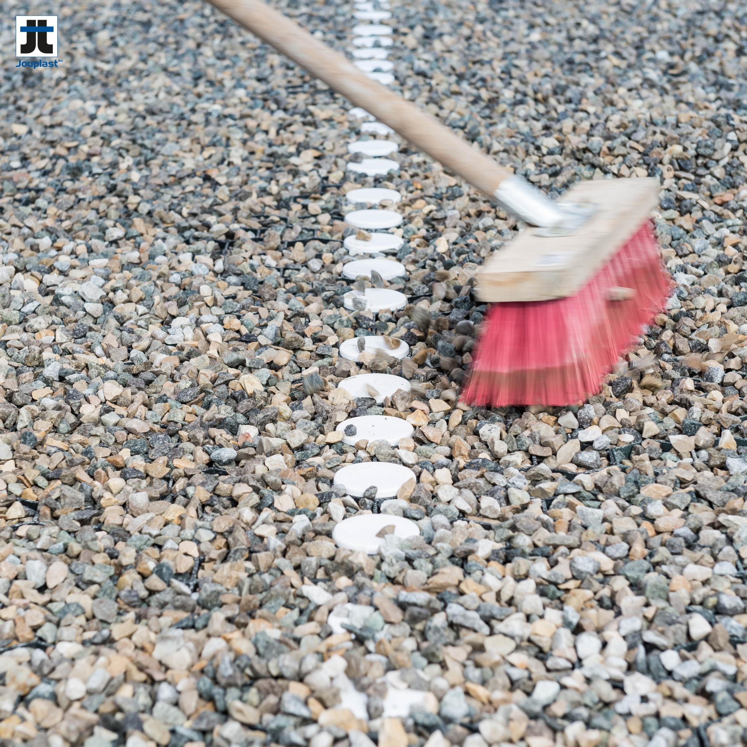 Une fois les dalles de stabilisation posées et le gravier déposé, il vous suffit de ratisser le gravier ou de le balayer pour le mettre en place dans les alvéoles.